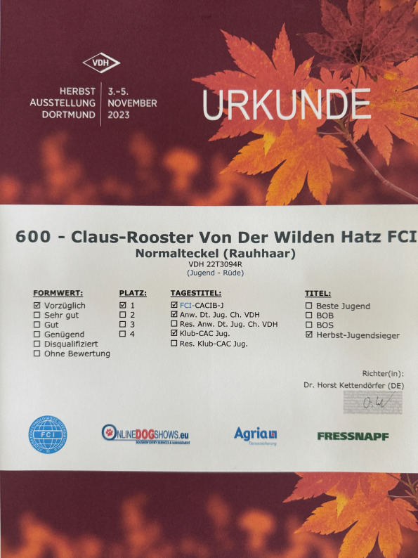 Sp/J 2. Preis, Italien-Inter-Vp 2. Preis, Italien-SchwhK 2. Preis, Italien-BhFK95 1. Preis, Italien-Fbja 1. Preis, BhFK95/J bestanden, ESw/J bestanden, BhN/F verliehen, SchwhN verliehen